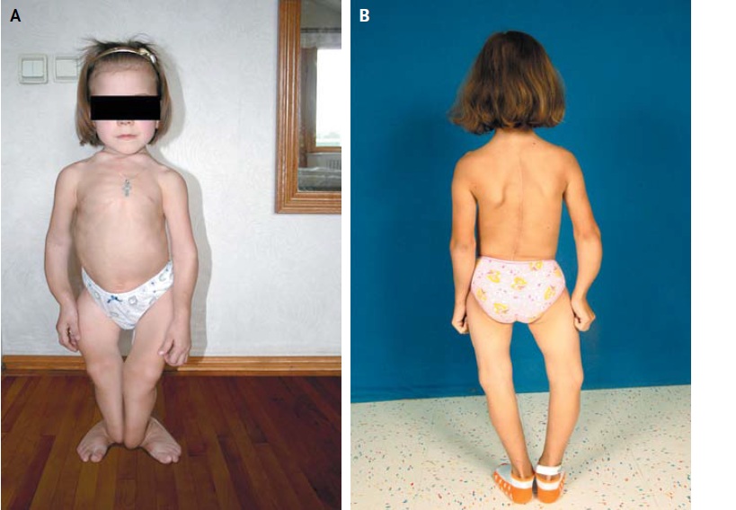 Двенадцатилетняя девочка из Украины была госпитализирована в клинику Бостона для оценки анамнеза переломов длинных костей и задержки развития. При поступлении у ребенка зафиксирована гипокальциемия (1,7 ммоль/л), низкий уровень 25-гидроксивитамина D (12 нмоль/л), повышенная концентрация паратгормона (435 пг/мл), увеличенный уровень щелочной фосфатазы (546 ЕД/л) и нормальная концентрация фосфора (1,3 ммоль/л). Полученные результаты свидетельствовали о дефиците витамина D – рахите. Кроме этого, у девочки наблюдались давние последствия рахита: утолщения ребер в местах перехода костной ткани в хрящевую (рахитические четки), тяжелый сколиоз в области грудного отдела позвоночника и двусторонние большеберцово-малоберцовые вальгусные деформации (рис. А). Было выяснено, что с питанием ребенок не получал достаточного количества витамина D и кальция. У девочки наблюдалась дискинезия желчевыводящих путей, которая могла способствовать недостаточной абсорбции жирорастворимых витаминов, включая витамин D. В клинике ребенок был консультирован по вопросам питания и начато дополнительное введение кальция и витамина D. Проведен спондилодез и двусторонние большеберцово-малоберцовые остеотомии со значительным улучшением (рис. В).