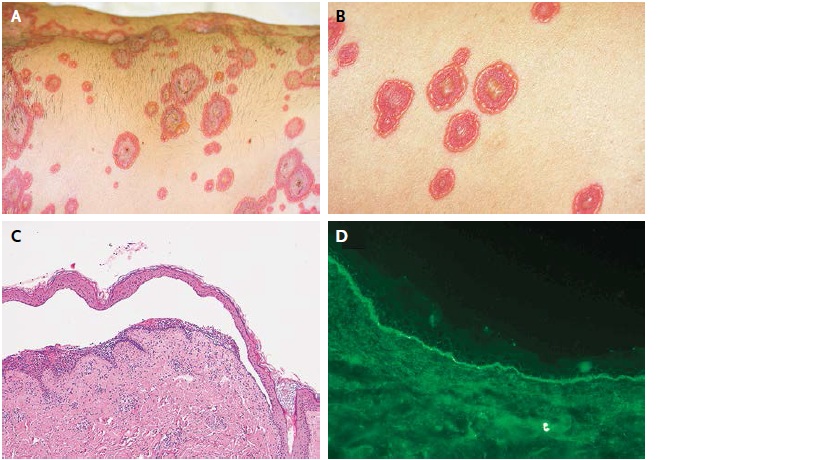 В целом практически здоровый 47-летный мужчина обратился за медицинской помощью по поводу обширных буллезных высыпаний, который начали формироваться последние 10 сут. Пациент не принимал лекарственные вещества на момент начала появления высыпаний, его состояние прогрессирующе ухудшалось. Эритематозные очаги усыпали практически всю поверхностью тела. Высыпания покрывали многочисленные напряженные везикулы и слабонаполненные буллы (рис. А. и В) размером от 1 до 5 см в диаметре и заполненные практически светлой желтой жидкостью. Новые высыпания появлялись по периферии ранее сформировавшихся. На грудной клетке и пояснице располагались несколько очагов оголенной кожи. Отмечено несколько крупных эрозий в ротовой полости. В патологический процесс были также вовлечены лицо, руки и стопы. По данным клинического исследования, биопсии кожи (рис. С, гематоксилин и эозин), непосредственного иммунофлюоресцирующего анализа (рис. D) был поставлен диагноз линеарного IgA-зависимого буллезного дерматоза. Это аутоиммунное заболевание, характеризующееся субэпидермальными буллами, вызванное IgA аутоантителами к антигенам базальной мембраны кожи и слизистой. Пациенту было назначено лечение дапзоном и системно глюкокортикоидами. При этом наступило полное клиническое разрешение в течение трех недель.