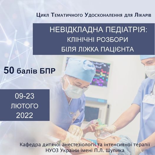З 09.02 по 23.02.2022 р. кафедра дитячої анестезіології та інтенсивної терапії НУОЗ України імені П.Л. Шупика проводить ТУ «Невідкладна педіатрія: клінічні розбори (діагностика та інтенсивна терапія невідкладний станів у дітей) біля ліжка пацієнта».