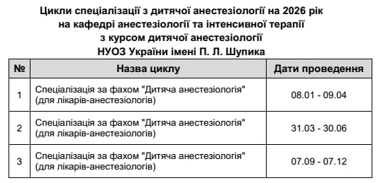 Цикли спеціалізації з дитячої анестезіології 2026 рік