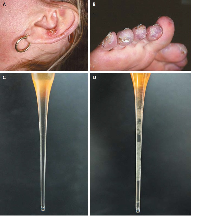 Пациентка 50 лет с детства страдает от болезненных поражений кожи, которые возникают на участках тела, подвергшихся охлаждению. Ухудшение состояния происходит каждую осень, а с наступлением весны клиника исчезает. При осмотре выявлены язвы и голубовато-фиолетовые пятна с корками и рубцовой тканью на ушах (рис. А), бедрах, коленях, пальцах ног и рук (рис. В). Схожие симптомы имеют и другие члены семьи. Лабораторная оценка показала уровень криофибриногена в плазме крови 850 мг/л. Криофибриногенемия — состояние, при котором в плазме, прозрачной при температуре 37°С (рис. С), при охлаждении до 4°С появляется осадок (рис. D). Криоглобулины можно выявить только в плазме, в сыворотке криофибриноген не выявляется. Симптомы возникают в результате окклюзии сосудов, расположенных на участках тела, которые подверглись охлаждению. Это состояние очень часто развивается у пациентов с воспалительными заболеваниями, инфекцией или раком. Однако были описаны и первичные семейные случаи, которые связаны с аутосомно-доминантным типом наследования. Этим пациентам назначали декстран, станозолол и нифидипин. Однако наиболее эффективным видом лечения является избегание холода.