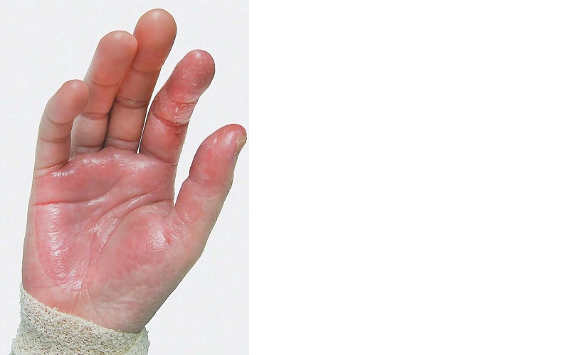 У 33-х летней женщины спустя 7 суток после операции Кесарева сечения в течение последних 4 суток отмечается лихорадка, боли в животе, эритродермия, артериальная гипотензия, АД 85/48 мм рт.ст. При обследовании выявлено повышение уровня креатинина и ферментов печени. В посевах мочи и влагалища был выделен золотистый стафилококк. На следующий день состояние пациентки ухудшилось с развитием острого респираторного дистресс синдрома. Позднее возникла десквамация кожи рук. На основании указанных данных был выставлен диагноз токсического шока стафилококкового генеза, состояния для которого характерна десквамация кожи. Слущивание кожных покровов обычно возникает на 1-2 неделе после начала заболевания. Типичным является вовлечение в процесс ладоней и подошв. Поддерживающая терапия и назначение флоксациллина способствовали полному выздоровлению пациентки. Кожные проявления разрешились в течение 4 недель после начала заболевания. Токсический шок стафилококкового генеза может возникать сразу после родов и хирургического вмешательства, при использовании барьерных контрацептивов, стафилококковой пневмонии, синуситах, инфицированных поражениях кожи.