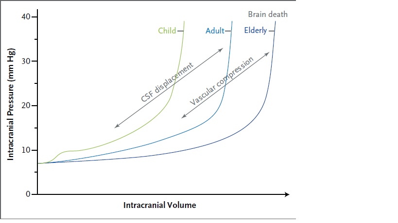 Теоретическая кривая внутричерепного комплайенса показывает, что небольшое увеличение внутричерепного давления в пределах правой части кривой ведет к большому изменению внутричерепного давления. Изначальный рост внутричерепного объема ведет к перемещению спинномозговой жидкости. При дальнейшем увеличении объема сосуды сдавливаются, что сопровождается уменьшением мозгового кровотока. Давление увеличивается более быстро у детей и с меньшей скоростью у пожилых в силу соответственно более высокого и низкого соотношений объема головного мозга к внутричерепному пространству.